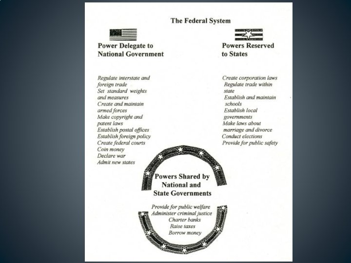 State and Federal Governments • Most wanted a strong national government to replace the Articles of Confederation • They also wanted to protect popular sovereignty • The delegates decide to share power between the federal and state governments federalism