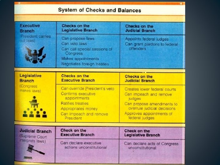 Checks and Balances • The writers of the Constitution developed checks and balances to keep any branch from becoming too powerful • Examples – The president can veto, or reject, laws passed by Congress – Congress can override the veto with a 2/3 majority vote – The Supreme court can review laws passed by Congress and declare them unconstitutional