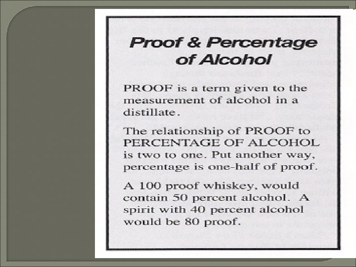 What is proof? Percentage of alcohol volume. To determine the percentage, divide proof by 2 (80 proof is 40% alcohol) The more alcohol concentrate, the faster it is absorbed.