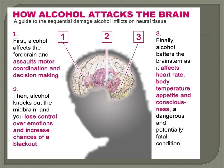 Effects of alcohol on the body Alcohol immediately enters the blood stream and circulates to all body parts. NO DIGESTION IS NEEDED. Once it reaches the brain it: • Delays reactions • Loss of inhibitions • Impaired coordination and senses (vision, hearing and speech. ) • Slowed reflexes and mental process • Impaired judgment • Illness (blackouts, hangovers, headache)