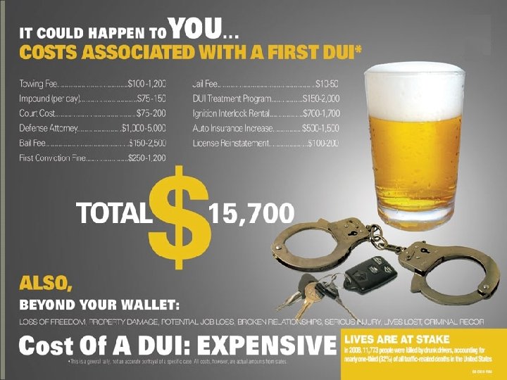 KNOW THE LAW!!! Caught using a fake I. D. - They are illegal to have in possession and can result in drivers license suspension. Attempt to purchase- Suspension of driver’s license. Zero Tolerance- If you are driving with ANY level of alcohol in your system you get 4 points on your driving record, heavier fines, OWI, DUI, MIP etc. Youth Consumption- Illegal to have ANY amount of alcohol in body at any time. Can get 90 days in jail and up to $500 in fines.