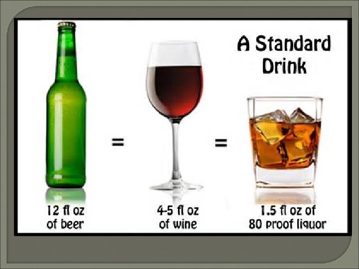 What is a drink? Beer: 12 oz. Wine: 5 oz. Liquor: 1. 5 oz. What beverage has more alcohol in it?
