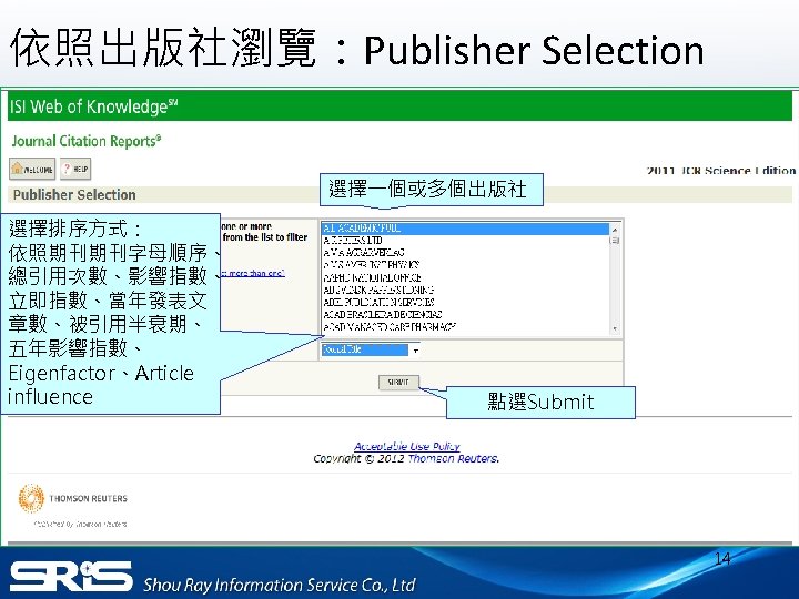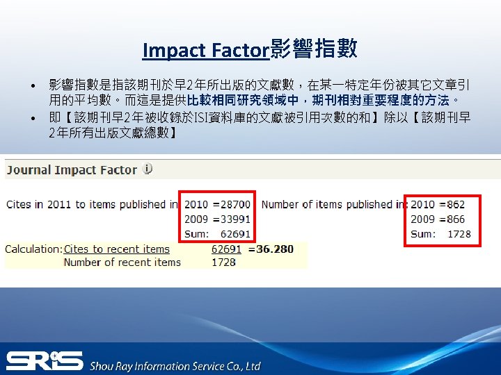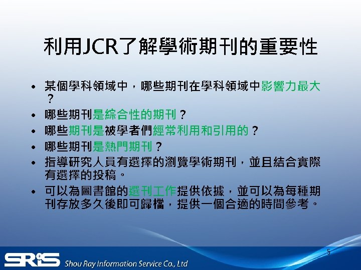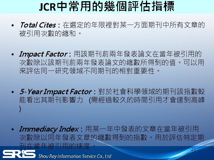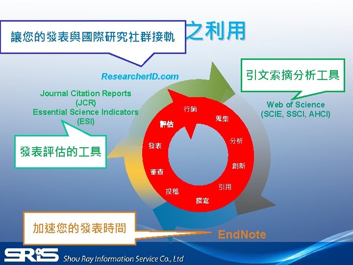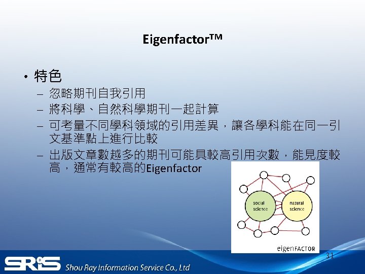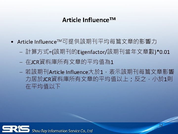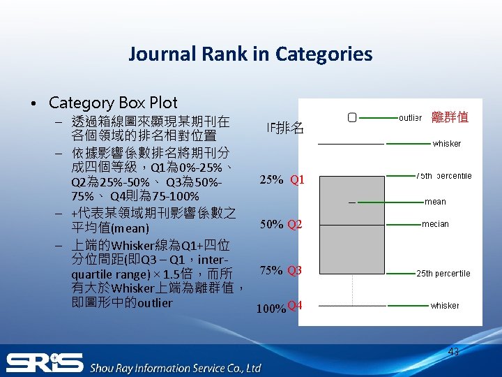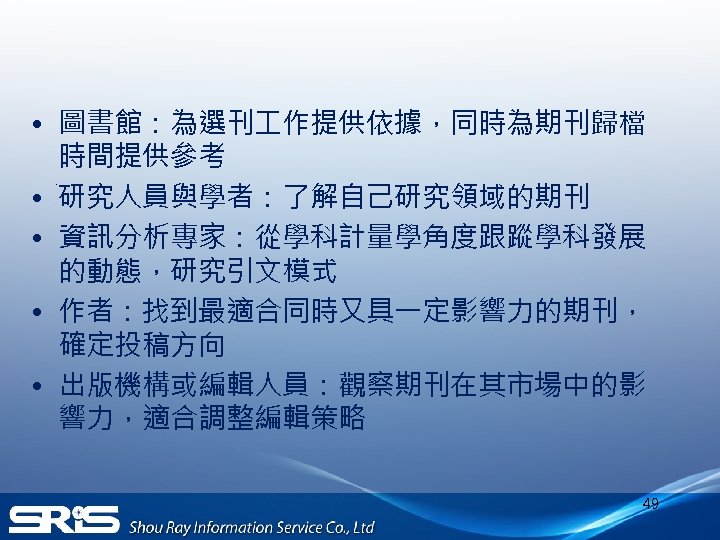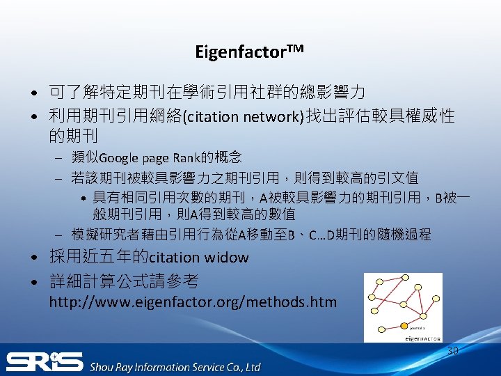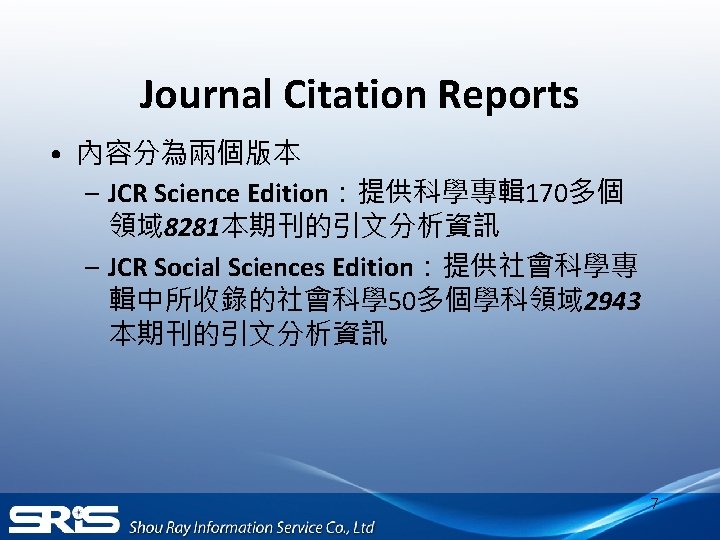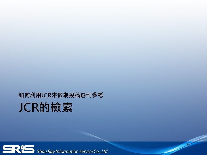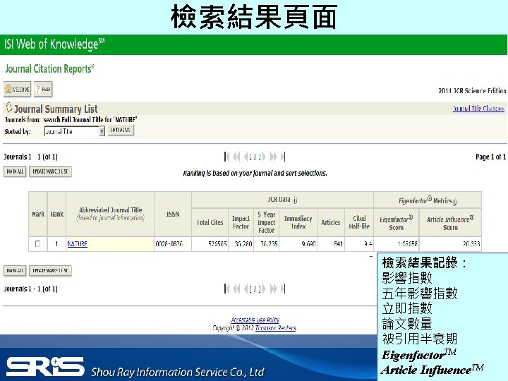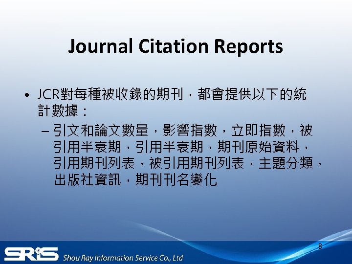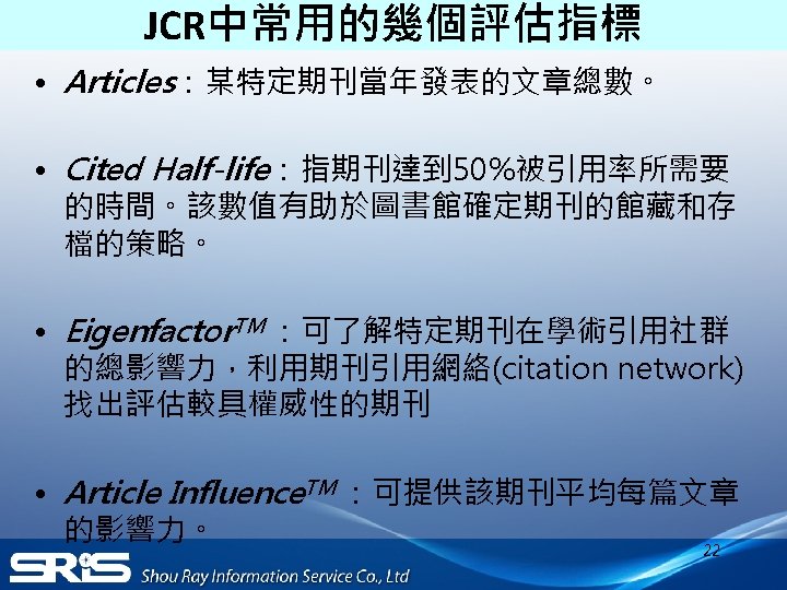 Journal Citation Reports Journal Citation Reports Journal Citation Slides: 49 Download presentation 大綱 • • • 學術期刊評估性 具的重要 Journal Citation Reports 的簡介 Journal Citation Reports 的檢索 Journal Citation Reports 指標介紹 結論 2 Subject Category Scope Note 13 Citation Behavior, variance among disciplines: There are inherent differences between different fields with regards to citation behavior. For some fields such as Mathematics or Economics it takes longer to reach the peak of citation activity. 點選Impact Factor Trends 查看五年影響指數 39 Nature期刊排名 總期刊數 影響係數排名 四分位百分比排名 • MULTIDISCIPLINARY SCIENCES領域 • Nature於MULTIDISCIPLINARY SCIENCES領域之影響係數排名第 1,為前 25%(Q 1) 42 Nature期刊箱型圖 Nature之IF為 36. 280, 於MULTIDISCIPLINARY SCIENCES領域屬Q 1,排 名前25%,且為離群值 MULTIDISCIPLINARY SCIENCES領域IF排名前3 名期刊,為離群值 44 QUIZ! u請問 JOURNAL CITATION REPORTS 的 SCIENCE EDITION 中, 共有幾本台灣期刊被收錄? 而其中 IMPACT FACTOR 最高的為哪一本期 刊? 45 Step 1. Step 2. 46 Step 3. Find the Answer!! 47 Conclusion JCR的用途 48 Thank You 台灣地區獨家代理--碩睿資訊有限公司 電話: 02 -8226 -8587 傳真: 02 -8226 -5022 網站:http: //www. isiuser. com http: //www. sris. com. tw 50
