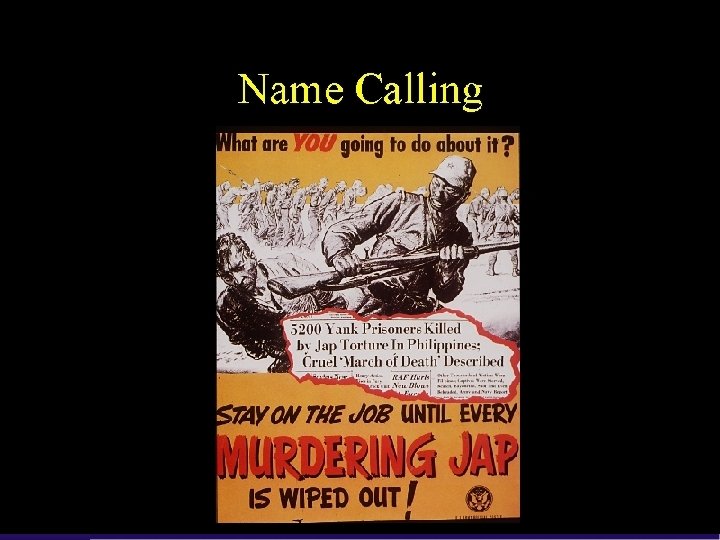 Propaganda Techniques ¨ Classic techniques of demonization – Lee & Lee (1939) and (1952) • identify 9 common techniques • First book analyzed Father Coughlin speeches • Second is systematic study of propaganda ¨ Function: – Induce motivation to fight – Frame issue and parties to conflict – Stimulate and manage opinion formation – Enhance rally effects