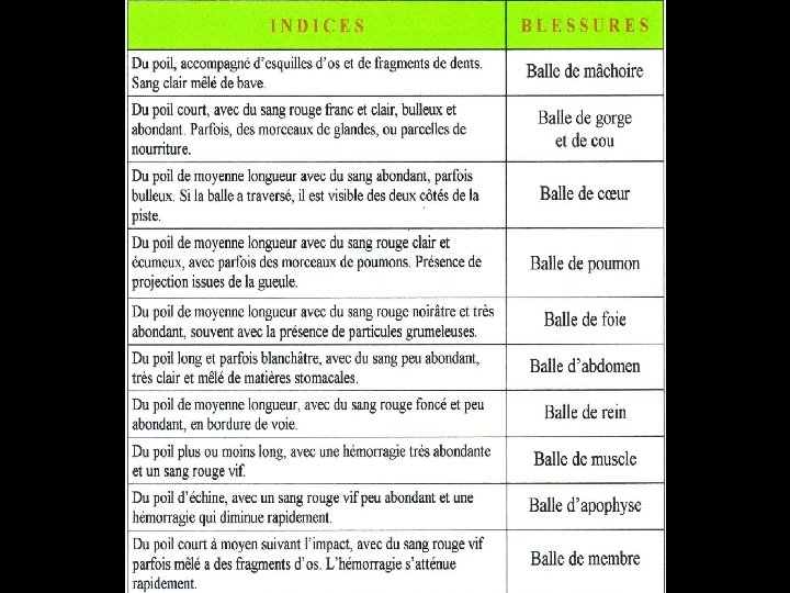 PLACEMENT DE BALLE DECONSEILLE 5. Tir au cou, sous la colonne : beaucoup de chance de perdre l'animal. 6. Tir de colonne, trop haut, balle d'apophyse; l'animal tombe puis se relève dans un plus ou moins bref délai. 7. Tir au coffre : balle trop en arrière : fuite certaine sur une longue distance, avec un calibre léger; si le tir touche le foie (légèrement en avant de ce point), mort rapide. 8. Tir de colonne : l'animal est immobilisé, vivant; balle d'achèvement nécessaire; peut être classé dans les bonnes balles, mais à éviter, car zone à atteindre, très étroite. 9. Tir de cuisse : si le bassin n'est pas touché, fuite sur longue distance, sauf si l'artère fémorale est sectionnée (distance de fuite plus réduite, mais nécessitant sûrement recherche).