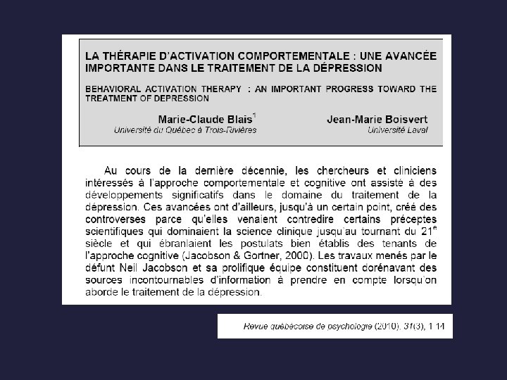 L’activation comportementale: utile pour aider les personnes à la phase de survivance? n En bref: n Version contemporaine d’une approche développée dans les années 70 n A reçu un large appui empirique n Équipe de N. Jacobson l’a remise de l’avant suite à étude démantèlement en 1996 n À l’origine pour traiter la dépression et prévenir rechute n Intérêt pour son utilisation en clinique auprès de personnes atteintes de cancer 30