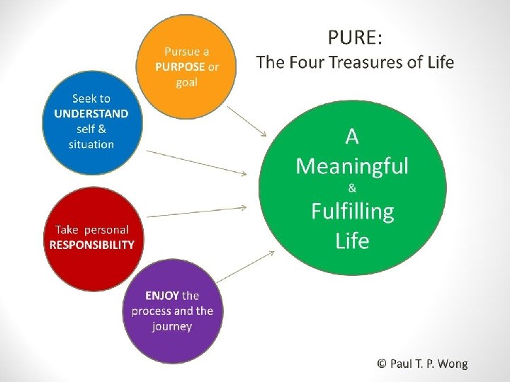 Sources of Meaning According to Wong (1998), there are 8 sources of meaning and the good life. 1. Achievement 5. Relationship 2. Acceptance 6. Religion 3. Transcendence 7. Fairness 4. Intimacy 8. Positive emotions