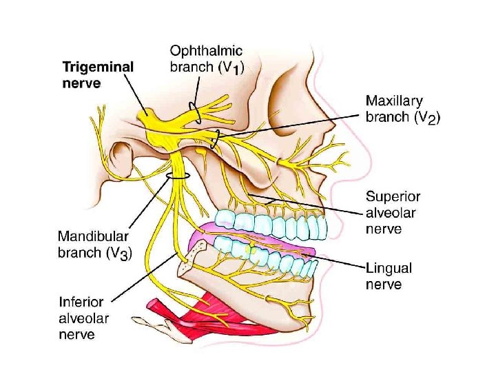 General Sensory Distribution of Maxillary Nerve • Mucous membrane of most of nasal cavity • Mucous membrane of roof of oral cavity = hard and soft palate • Skin of lower eyelid, lateral nose, prominence of cheek, skin and mucous membrane of upper lip, maxillary teeth