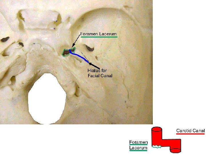 The grater petrosal nerve reenters the cranial cavity through hiatus of the facial canal (hiatus for greater petrosal nerve). It is now on the floor of the cranial cavity. It leaves the cranial cavity a second time by entering the carotid canal and passing through a defect in its floor, the foramen lacerum.