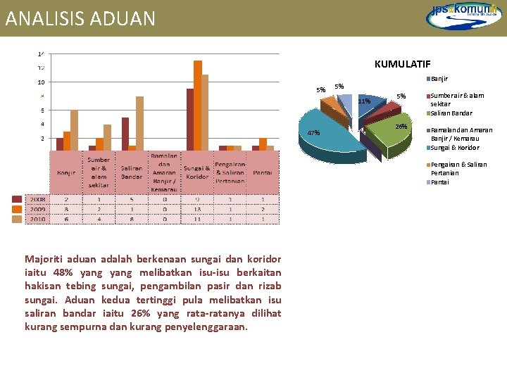 ANALISIS ADUAN KUMULATIF 5% Banjir 5% 11% 47% 5% 26% Sumber air & alam sekitar Saliran Bandar Ramalan dan Amaran Banjir / Kemarau Sungai & Koridor Pengairan & Saliran Pertanian Pantai Majoriti aduan adalah berkenaan sungai dan koridor iaitu 48% yang melibatkan isu-isu berkaitan hakisan tebing sungai, pengambilan pasir dan rizab sungai. Aduan kedua tertinggi pula melibatkan isu saliran bandar iaitu 26% yang rata-ratanya dilihat kurang sempurna dan kurang penyelenggaraan.