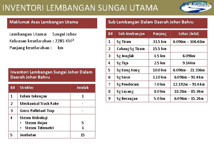 INVENTORI LEMBANGAN SUNGAI UTAMA Maklumat Asas Lembangan Utama Sub Lembangan Dalam Daerah Johor Bahru Lembangan Utama: Sungai Pulai Keluasan keseluruhan : 245. 8 KM² Panjang keseluruhan : 38 km Bil Sub-lembangan Panjang Lebar (Julat) 1 Sg Pekajang Lurus 1. 8 km 15. 24 m 2 Sg Pekajang Bengkok 1. 8 km 9. 144 m 3 Sg Perepat 1. 0 km 9. 144 m 4 Sg Kenanga 3. 5 km 5. 486 m 5 Sg Pak Gadai 2. 5 km 5. 486 m 6 Sg Tebuan 0. 9 km 6. 096 m Jumlah 7 Sg Pasir 0. 7 km 6. 096 m Inventori Lembangan Sungai Pulai Dalam Daerah Johor Bahru Bil Struktur 1 Kolam takungan 3 8 Sg Senapang 1. 5 km 15. 24 m 2 Mechanical Trash Rake - 9 Sg Suka Besar 0. 9 km 9. 144 m 3 Gross Pollutant Trap - 10 Sg Suka Kechil 0. 6 km 18. 288 m 4 Stesen Hidrologi • Stesen Hujan • Stesen Telemetri - 11 Sg Gelang Patah 9. 0 km 6. 096 m – 76. 2 m 5 Jambatan 5