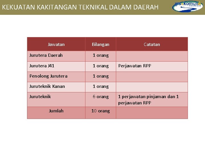 KEKUATAN KAKITANGAN TEKNIKAL DALAM DAERAH Jawatan Bilangan Jurutera Daerah 1 orang Jurutera J 41 1 orang Penolong Jurutera 1 orang Juruteknik Kanan 1 orang Juruteknik 6 orang Jumlah 10 orang Catatan Perjawatan RPP 1 perjawatan pinjaman dan 1 perjawatan RPP