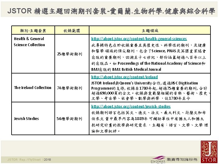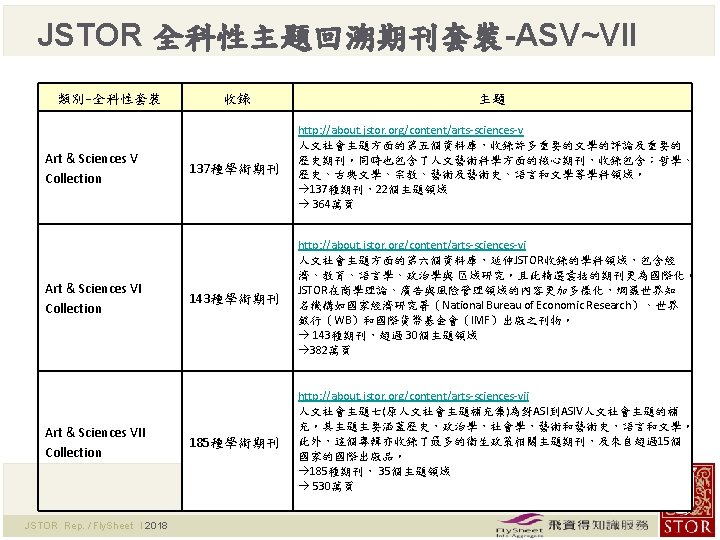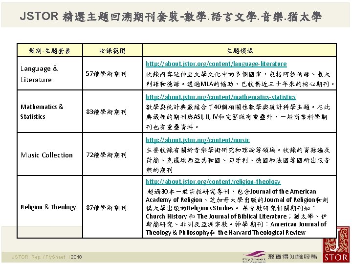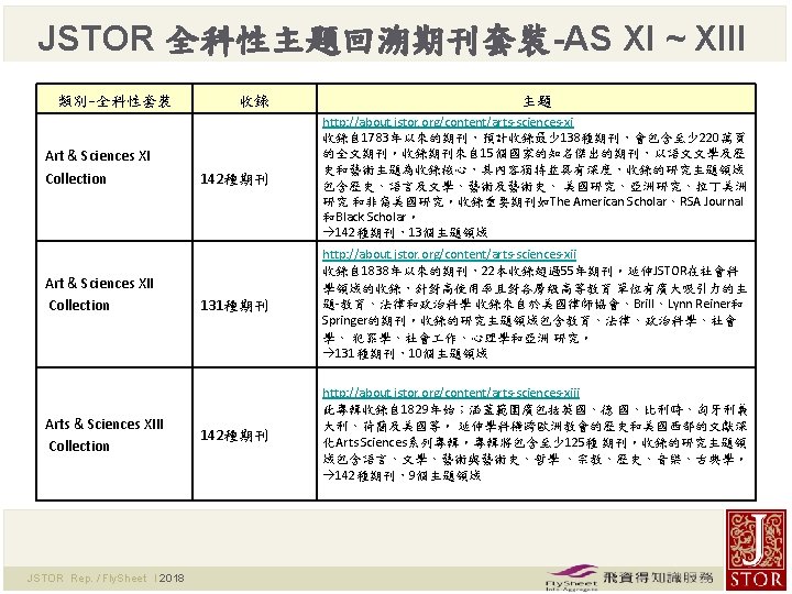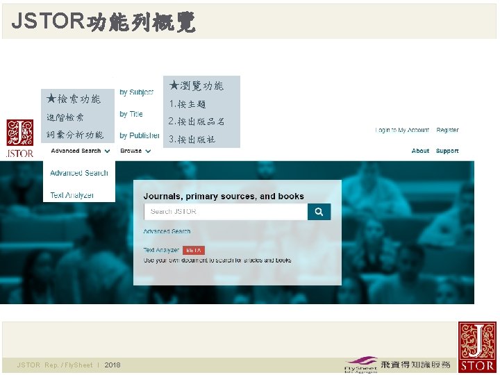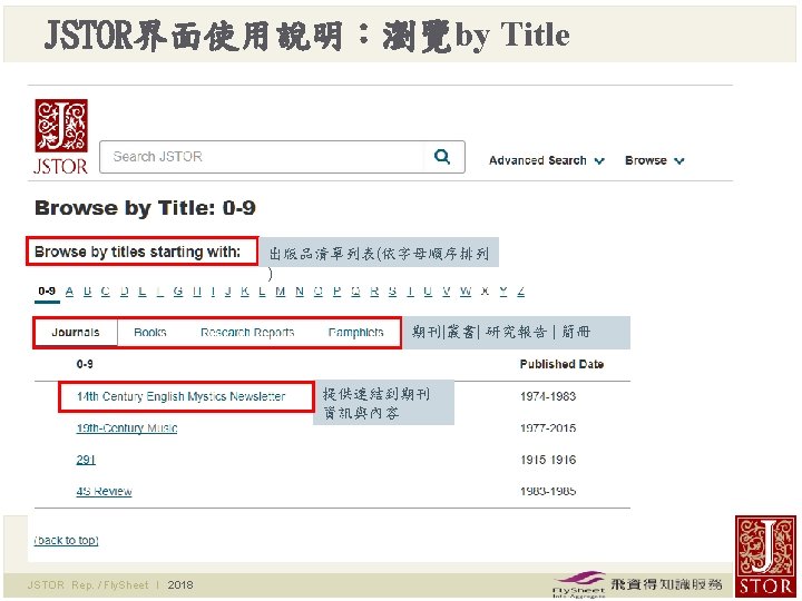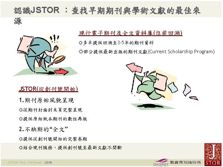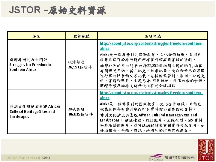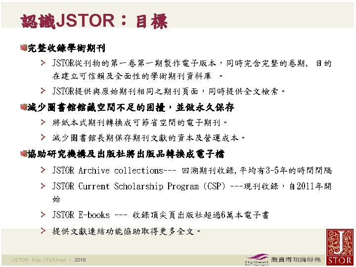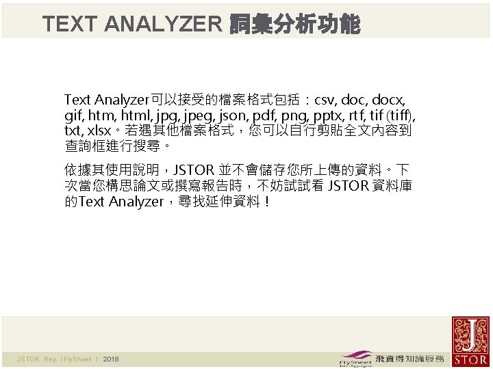 JSTOR Fly Sheet InfoAggregate JSTOR Rep Fly Sheet Slides: 51 Download presentation 資料庫教育訓練 :JSTOR 使用指南 Fly. Sheet Info-Aggregate JSTOR Rep. / Fly. Sheet l 2018 今日內容: 1. 認識JSTOR 2. JSTOR 特色:“Moving Wall” 3. JSTOR收錄內容及書目清單下載 4. JSTOR 回溯套裝內容說明 5. JSTOR界面使用說明 6. My Workspace功能說明 7. TEXT ANALYZER 詞彙分析功能 JSTOR Rep. / Fly. Sheet l 2018 1. 認識JSTOR 2. JSTOR 特色:“Moving Wall” 3. JSTOR收錄內容及書目清單下載 4. JSTOR 回溯套裝內容說明 5. JSTOR界面使用說明 6. My Workspace功能說明 7. TEXT ANALYZER 詞彙分析功能 JSTOR Rep. / Fly. Sheet l 2018 1. 認識JSTOR 2. JSTOR 特色:“Moving Wall” 3. JSTOR收錄內容及書目下載 4. JSTOR 回溯套裝內容說明 5. JSTOR界面使用說明 6. My Workspace功能說明 7. TEXT ANALYZER 詞彙分析功能 JSTOR Rep. / Fly. Sheet l 2018 JSTOR特色: “Moving Wall” (時間間隔 ) The China Journal **JSTOR期刊收錄之保障 Moving wall: 3 years • 收錄後不會被JSTOR 移除 • 一旦不再新增卷期後Moving Wall將會固定 JSTOR Collection(s): Arts & Sciences I Collection JSTOR Discipline(s): Asian Studies In 2017 • 訂購單位只需負擔一次該回溯套裝的內容建置費 • JSTOR會確保(曾)收錄於JSTOR平台上的所有期刊 將與JSTOR平台同步技術更新及永久保存 1995 ---- 2013 2014 2015 2016 2017 Content found in JSTOR One year added to JSTOR In 2017 1995 ---- 2013 + 2014 2015 2016 2017 2018 Content found in JSTOR-Moving Wall說明http: //www. jstor. org/page/info/about/archives/journals/moving. Wall. jsp JSTOR Rep. / Fly. Sheet l 2018 1. 認識JSTOR 2. JSTOR 特色:“Moving Wall” 3. JSTOR收錄內容及書目清單下載 4. JSTOR 回溯套裝內容說明 5. JSTOR界面使用說明 6. My Workspace功能說明 7. TEXT ANALYZER 詞彙分析功能 JSTOR Rep. / Fly. Sheet l 2018 1. 認識JSTOR 2. JSTOR 特色:“Moving Wall” 3. JSTOR收錄內容及書目清單下載 4. JSTOR 回溯套裝內容說明 5. JSTOR界面使用說明 6. My Workspace功能說明 7. TEXT ANALYZER 詞彙分析功能 JSTOR Rep. / Fly. Sheet l 2018 JSTOR界面使用說明:瀏覽by Subject 精選專題 主題清單列表 JSTOR Rep. / Fly. Sheet l 2018 檢索結果列表 1: 文獻列表 / Items Results 依格式需求( Ref. Works, RIS File,Text File) 匯出文獻 JSTOR Rep. / Fly. Sheet l 2018 依格式需求( MLA, CHICAG O, APA)進行 文獻複製 文獻輸出: Download PDF JSTOR Rep. / Fly. Sheet l 2018 1. 認識JSTOR 2. JSTOR 特色:“Moving Wall” 3. JSTOR收錄內容及書目清單下載 4. JSTOR 回溯套裝內容說明 5. JSTOR界面使用說明 6. My Workspace功能說明 7. TEXT ANALYZER 詞彙分析功能 JSTOR Rep. / Fly. Sheet l 2018 個人化服務: Login to My JSTOR 登入 /註冊 My Account **第一次使用者請先申請個人帳號 JSTOR Rep. / Fly. Sheet l 2018 1. 認識JSTOR 2. JSTOR 特色:“Moving Wall” 3. JSTOR收錄內容及書目清單下載 4. JSTOR 回溯套裝內容說明 5. JSTOR界面使用說明 6. My Workspace功能說明 7. TEXT ANALYZER 詞彙分析功能 JSTOR Rep. / Fly. Sheet l 2018 TEXT ANALYZER 詞彙分析功能 jstor. org/analyze JSTOR “ Text Analyzer”,能自動判讀、分析一段文章的關鍵字及其 權重,並查詢出 JSTOR 中的相關文獻。 JSTOR Rep. / Fly. Sheet l 2018 產品資訊及教育訓練 請洽: 飛資得知識服務股份有限公司 Tel - (02)26575996 Fax - (02)26577071 E-mail - products@flysheet. com. tw Website http: //econtent. flysheet. com. tw JSTOR Rep. / Fly. Sheet l 2018