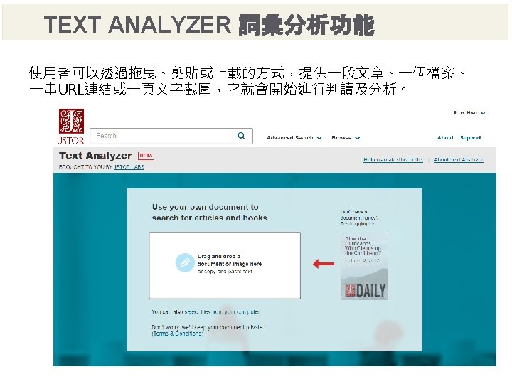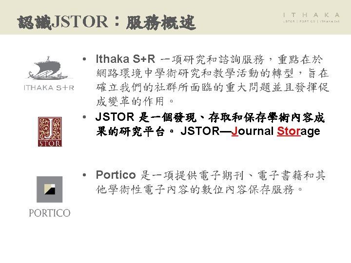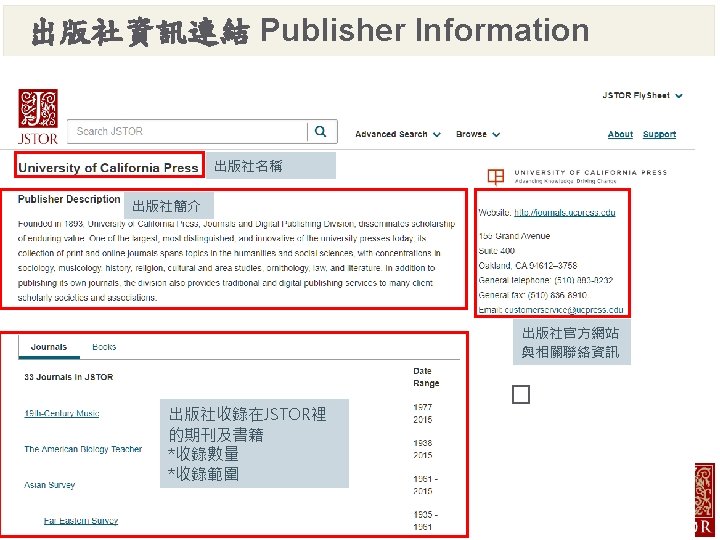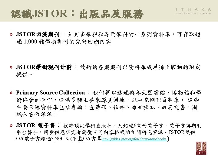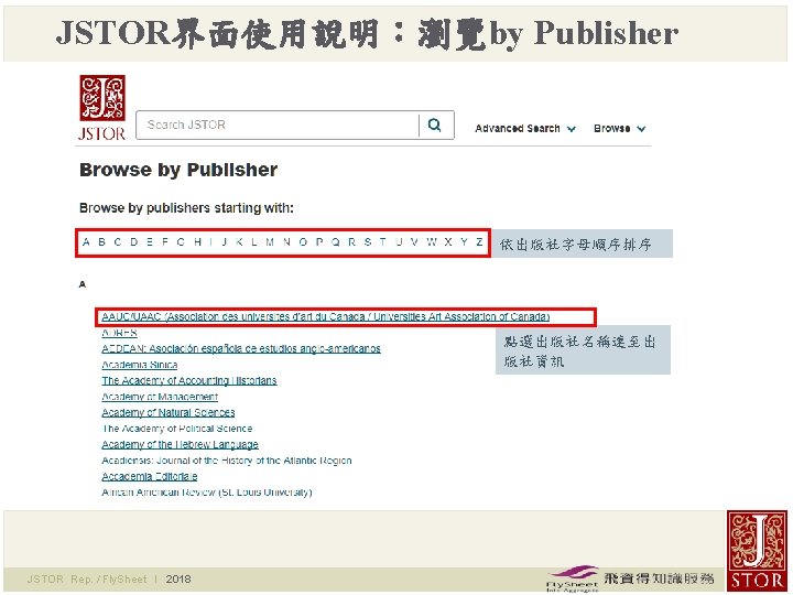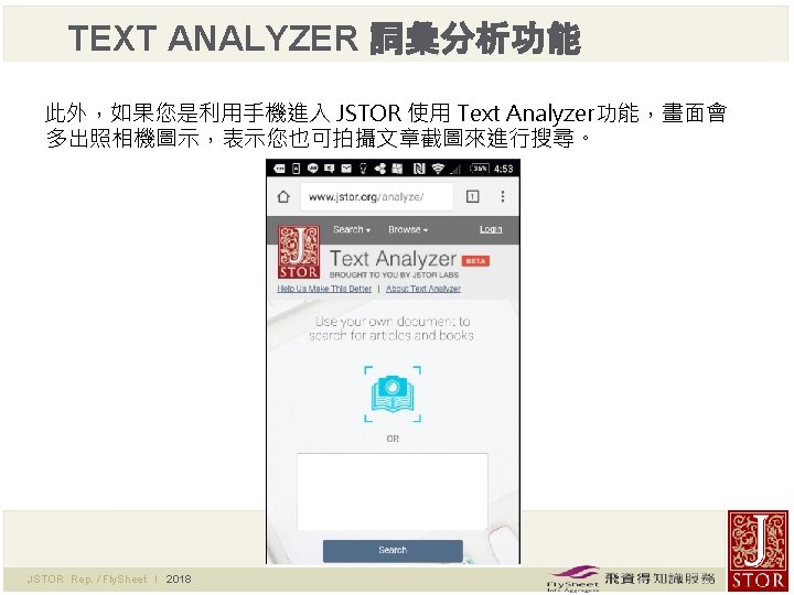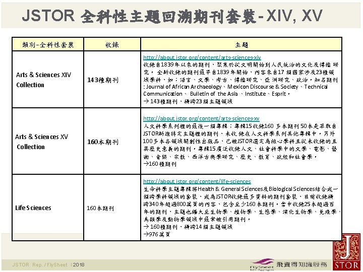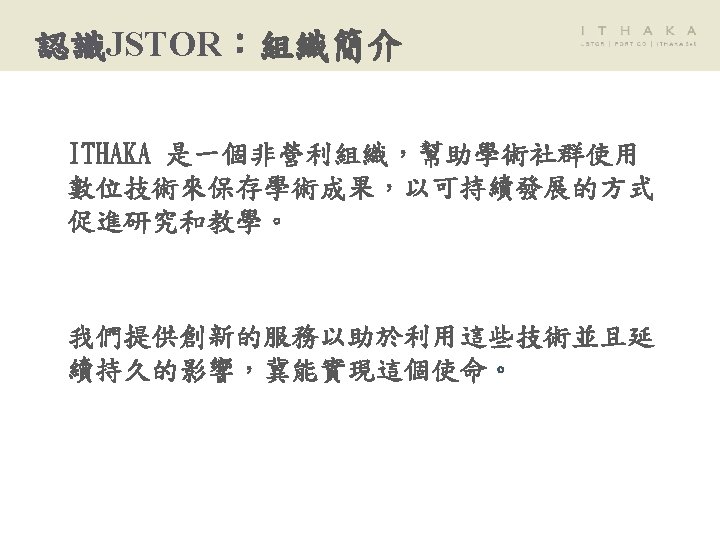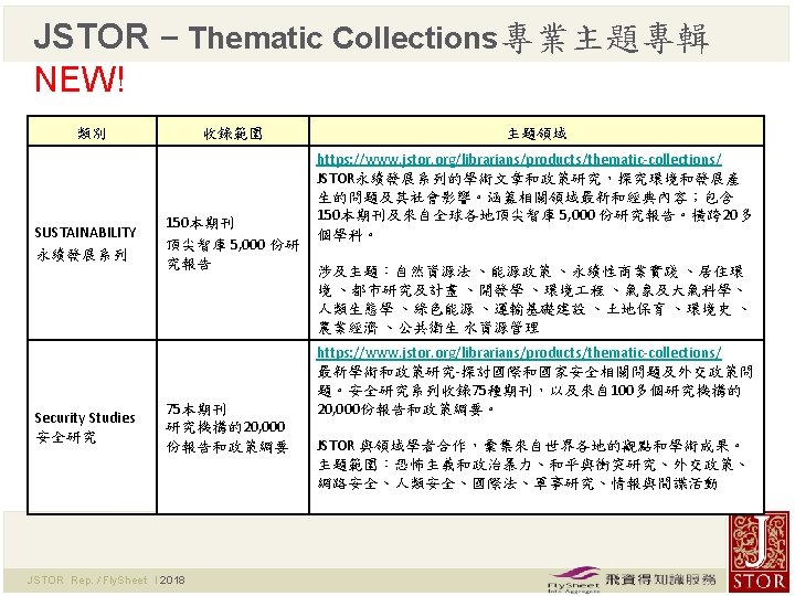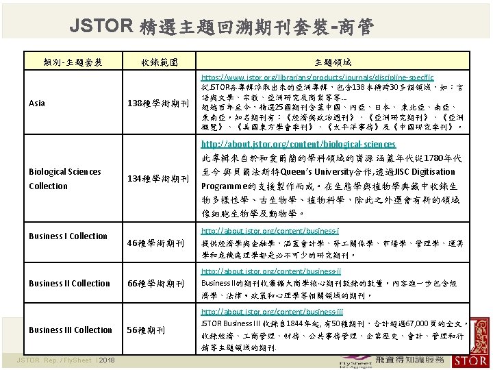 JSTOR Fly Sheet InfoAggregate JSTOR Rep Fly Sheet Slides: 51 Download presentation 資料庫教育訓練 :JSTOR 使用指南 Fly. Sheet Info-Aggregate JSTOR Rep. / Fly. Sheet l 2018 今日內容: 1. 認識JSTOR 2. JSTOR 特色:“Moving Wall” 3. JSTOR收錄內容及書目清單下載 4. JSTOR 回溯套裝內容說明 5. JSTOR界面使用說明 6. My Workspace功能說明 7. TEXT ANALYZER 詞彙分析功能 JSTOR Rep. / Fly. Sheet l 2018 1. 認識JSTOR 2. JSTOR 特色:“Moving Wall” 3. JSTOR收錄內容及書目清單下載 4. JSTOR 回溯套裝內容說明 5. JSTOR界面使用說明 6. My Workspace功能說明 7. TEXT ANALYZER 詞彙分析功能 JSTOR Rep. / Fly. Sheet l 2018 1. 認識JSTOR 2. JSTOR 特色:“Moving Wall” 3. JSTOR收錄內容及書目下載 4. JSTOR 回溯套裝內容說明 5. JSTOR界面使用說明 6. My Workspace功能說明 7. TEXT ANALYZER 詞彙分析功能 JSTOR Rep. / Fly. Sheet l 2018 JSTOR特色: “Moving Wall” (時間間隔 ) The China Journal **JSTOR期刊收錄之保障 Moving wall: 3 years • 收錄後不會被JSTOR 移除 • 一旦不再新增卷期後Moving Wall將會固定 JSTOR Collection(s): Arts & Sciences I Collection JSTOR Discipline(s): Asian Studies In 2017 • 訂購單位只需負擔一次該回溯套裝的內容建置費 • JSTOR會確保(曾)收錄於JSTOR平台上的所有期刊 將與JSTOR平台同步技術更新及永久保存 1995 ---- 2013 2014 2015 2016 2017 Content found in JSTOR One year added to JSTOR In 2017 1995 ---- 2013 + 2014 2015 2016 2017 2018 Content found in JSTOR-Moving Wall說明http: //www. jstor. org/page/info/about/archives/journals/moving. Wall. jsp JSTOR Rep. / Fly. Sheet l 2018 1. 認識JSTOR 2. JSTOR 特色:“Moving Wall” 3. JSTOR收錄內容及書目清單下載 4. JSTOR 回溯套裝內容說明 5. JSTOR界面使用說明 6. My Workspace功能說明 7. TEXT ANALYZER 詞彙分析功能 JSTOR Rep. / Fly. Sheet l 2018 1. 認識JSTOR 2. JSTOR 特色:“Moving Wall” 3. JSTOR收錄內容及書目清單下載 4. JSTOR 回溯套裝內容說明 5. JSTOR界面使用說明 6. My Workspace功能說明 7. TEXT ANALYZER 詞彙分析功能 JSTOR Rep. / Fly. Sheet l 2018 JSTOR界面使用說明:瀏覽by Subject 精選專題 主題清單列表 JSTOR Rep. / Fly. Sheet l 2018 檢索結果列表 1: 文獻列表 / Items Results 依格式需求( Ref. Works, RIS File,Text File) 匯出文獻 JSTOR Rep. / Fly. Sheet l 2018 依格式需求( MLA, CHICAG O, APA)進行 文獻複製 文獻輸出: Download PDF JSTOR Rep. / Fly. Sheet l 2018 1. 認識JSTOR 2. JSTOR 特色:“Moving Wall” 3. JSTOR收錄內容及書目清單下載 4. JSTOR 回溯套裝內容說明 5. JSTOR界面使用說明 6. My Workspace功能說明 7. TEXT ANALYZER 詞彙分析功能 JSTOR Rep. / Fly. Sheet l 2018 個人化服務: Login to My JSTOR 登入 /註冊 My Account **第一次使用者請先申請個人帳號 JSTOR Rep. / Fly. Sheet l 2018 1. 認識JSTOR 2. JSTOR 特色:“Moving Wall” 3. JSTOR收錄內容及書目清單下載 4. JSTOR 回溯套裝內容說明 5. JSTOR界面使用說明 6. My Workspace功能說明 7. TEXT ANALYZER 詞彙分析功能 JSTOR Rep. / Fly. Sheet l 2018 TEXT ANALYZER 詞彙分析功能 jstor. org/analyze JSTOR “ Text Analyzer”,能自動判讀、分析一段文章的關鍵字及其 權重,並查詢出 JSTOR 中的相關文獻。 JSTOR Rep. / Fly. Sheet l 2018 產品資訊及教育訓練 請洽: 飛資得知識服務股份有限公司 Tel - (02)26575996 Fax - (02)26577071 E-mail - products@flysheet. com. tw Website http: //econtent. flysheet. com. tw JSTOR Rep. / Fly. Sheet l 2018