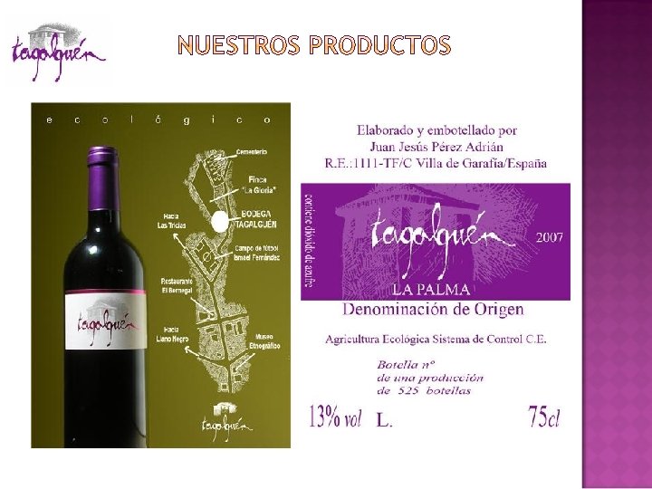 • 2000 COMPRAMOS LA FINCA LA GLORIA ABANDONADA DESDE LOS AÑOS 40 (EMIGRACIÓN A VENEZUELA). 350 METROS S. N. M. • 2002 PRIMERA PLANTACIÓN LISTÁN NEGRO Y CASTELLANA. • 2004 REESTRUCTURACIÓN VARIETAL 100% LISTÁN NEGRO Y ALGO DE TINTILLA. • 2005 PRIMERA COSECHA (VINO DE MESA). • 2007 PRIMERA COSECHA EN BODEGA PROPIA ( D. O. LA PALMA) REESTRUCTURACIÓN FINCA LAS NUBES A 1. 350 M. S. N. M. (ALBILLO). • 2008 SEGUNDA COSECHA. COMPRA DE UVA. OTRA MARCA.
