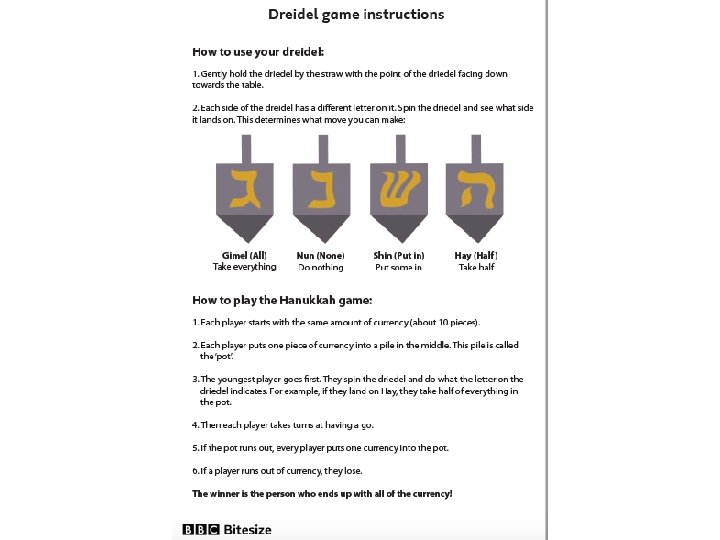 Hanukkah is a great time for eating delicious foods. Some dishes have special significance, such as latkes (a kind of potato fritter), pancakes and doughnuts. This is because they are fried in oil. When they make them, Jewish people remember the miracle of the oil lasting eight days in the temple. https: //www. bbc. co. uk/teach/class-clips-video/religious-studies-ks 1 -the-jewish-storyof-hanukkah/z 47 wxyc