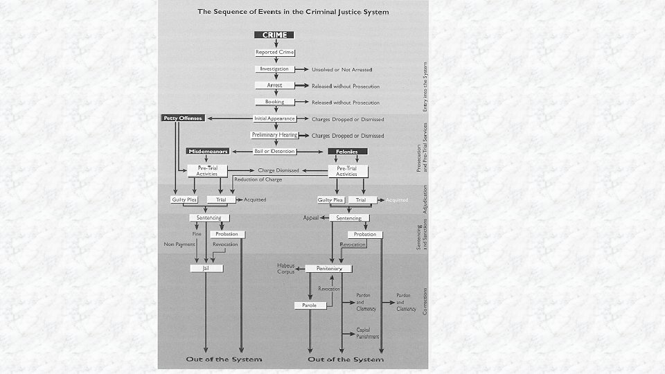 Pre-Trial for Criminal Cases • The most serious crimes are felonies, crimes such as robbery, assault with a deadly weapon, and sexual assault, for which the punishment on conviction is imprisonment at least a year, usually in a state or federal penitentiary. • Misdemeanors are less serious crimes, such as simple assault, driving while intoxicated, and trespassing, for which punishment on conviction could be a term of incarceration of less than a year, usually in a local jail. • Traffic infractions and petty misdemeanors include minor moving violations, parking violations and littering. They’re usually just punished by fines.
