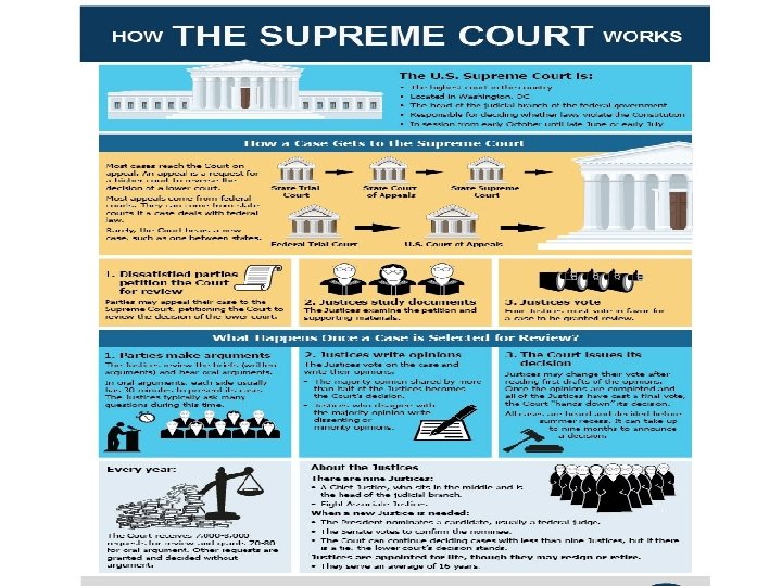 Role of the Supreme Court • If the Supreme Court finds that a law passed by Congress conflicts with (goes against) the Constitution it must declare the law unconstitutional. • The law is then “thrown out”. This power to review a law and decide whether it is constitutional or not is known as judicial review. • A Supreme Court decision sets a precedent (a rule that must be followed and applied to similar situations in the future) for all U. S. courts to follow when making their decisions.