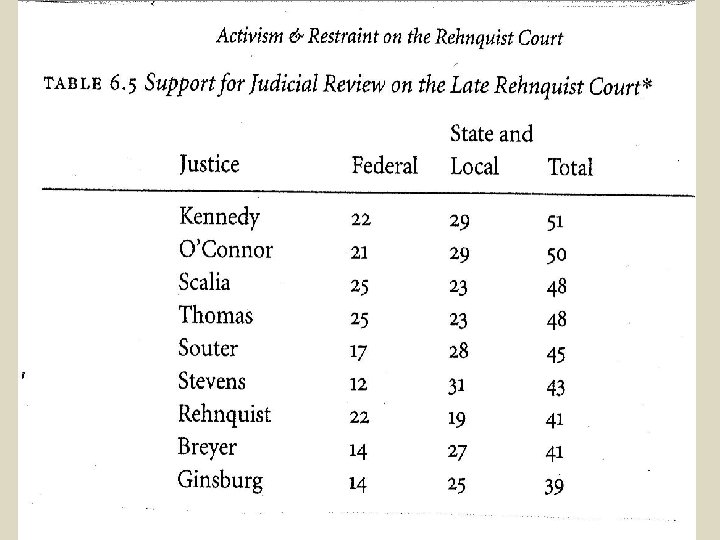 Voting Behavior of Justices, by Party Liberal Votes 90 80 Brennan 70 White Marshall 60 Blackmun 50 Rehnquist 40 Stevens 30 O'Connor 20 Scalia Souter 10 Thomas 0 W hi te M ar sh al Bl ac l km Re un hn qu ist St ev e O' ns Co nn or Sc al ia So ut e Th r om as Br ey Gi er ns bu rg Br en na n Breyer Ginsburg