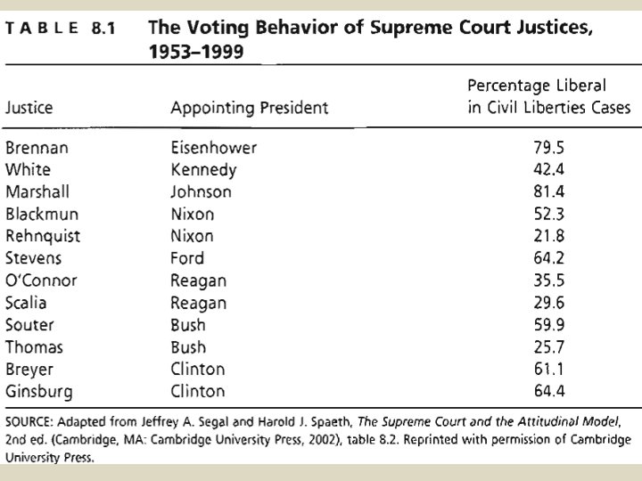 Attitudinal Model Justices’ votes are a function of their policy preferences This is self-defining, often common sense: Justice Scalia votes conservative over 70% of the time, so he’s a conservative Justices sometimes cast votes are inconsistent with their ideology