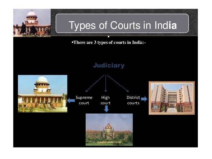 Subordinate courts • There are subordinate courts below the High court in each state. • The courts are under the complete control of the High court. The lower court (e. g. Nyaya Panchayat or Munsiffs court) deals with minor cases while the higher courts (e. g. , subordinate Judge’s court or District Judge’s court) deal with important cases. • Appeals lie to the higher courts from the lower courts. An appeal may also lie to the High Court against the decisions of the District judge’s court or the Session Judge’s court. • In a Presidency town, there are city civil courts and Metropolitan Magistrates courts. • In this connection, we are to note that most of the Judges of the subordinate courts are appointed by the Governor in consultation with the High Court of the concerned State.