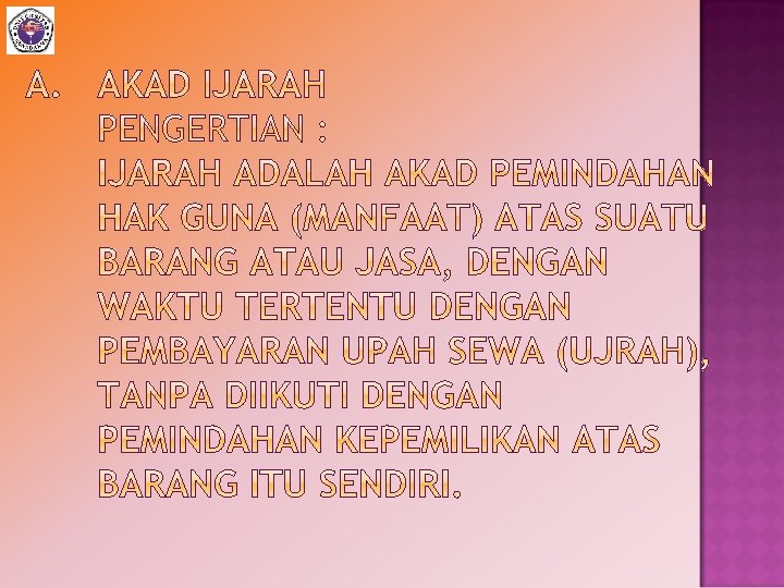 - IJARAH SEJENIS DENGAN AKAD JUAL BELI, NAMUN YANG DIPINDAHKAN BUKAN HAK KEPEMILIKANNYA, TAPI HAK GUNA ATAU MANFAAT, MANFAAT DARI SUATU ASSET ATAU DARI JASA/PEKERJAAN. - SEBALIKNYA PENYEWA ATAU PENGGUNA JASA MEMILIKI KEWAJIBAN MEMBAYAR SEWA ATAU UPAH.