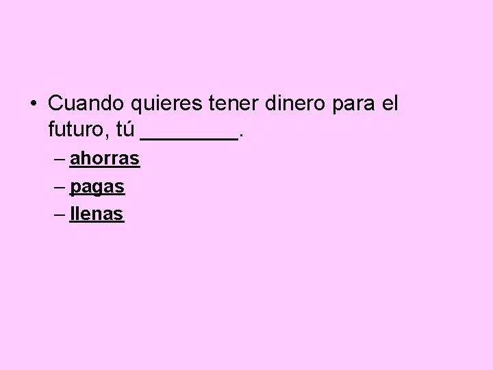 • Cuando quieres tener dinero para el futuro, tú ____. – ahorras – pagas – llenas