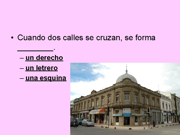 • Cuando dos calles se cruzan, se forma ____. – un derecho – un letrero – una esquina