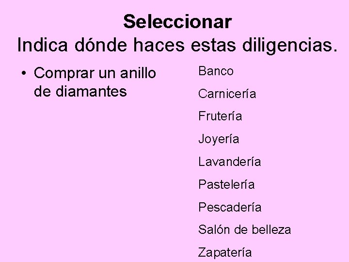 Seleccionar Indica dónde haces estas diligencias. • Comprar un anillo de diamantes Banco Carnicería Frutería Joyería Lavandería Pastelería Pescadería Salón de belleza Zapatería
