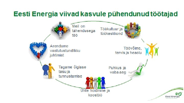 Eesti Energia 5 inimeste juhtimise põhimõtet 1. 2. 3. 4. 5. Me arvestame töötajate kui äripartneritega ja jagame informatsiooni Me loome andekatele töötajatele sobiva keskkonna, otsime kutsumusega inimesi ja keskendume inimeste loomupäraste tugevuste rakendamisele Me usume, et motiveeritud töötajate pühendunud töö tulemusena luuakse väärtus ja me hoiame motivatsiooni Me ei sea võrdusmärki inimese arengu ja karjääri vahele. Areng tähendab inimese potentsiaali avamist ja rakendamist Me mõõdame juhtimiskvaliteeti ja pühendumust. Saadud tulemustest õpime