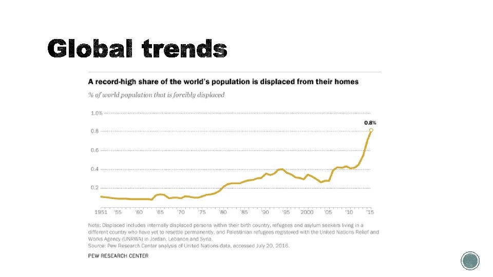 Forcibly displaced persons 65 million Internally displaced persons 40 million Durable solutions: Asylum seekers 3 million Repatriation Refugees 21 million Local integration Resettlement <1% Gobal Trends, 2015 http: //www. unhcr. org/576408 cd 7