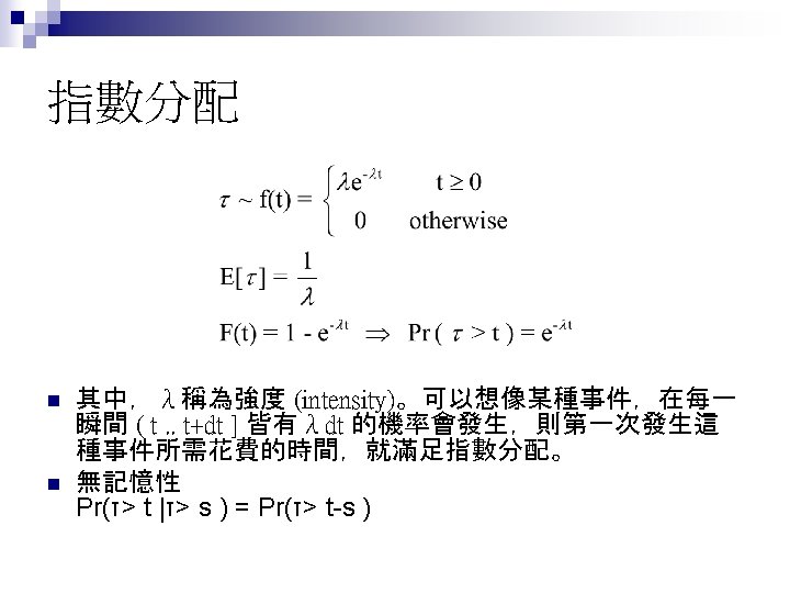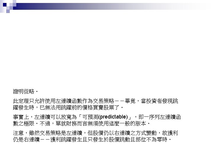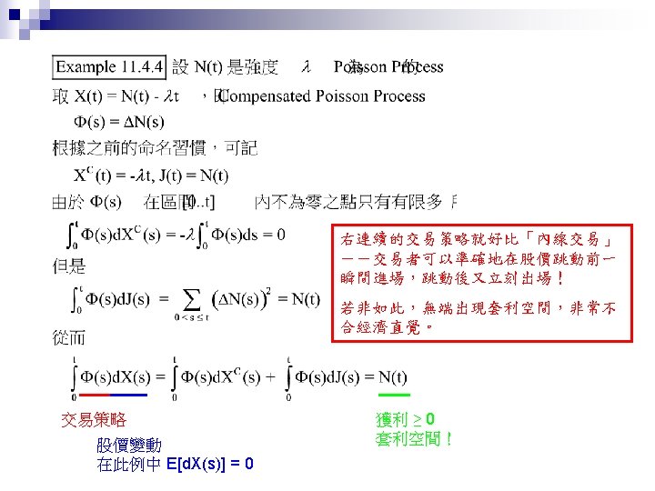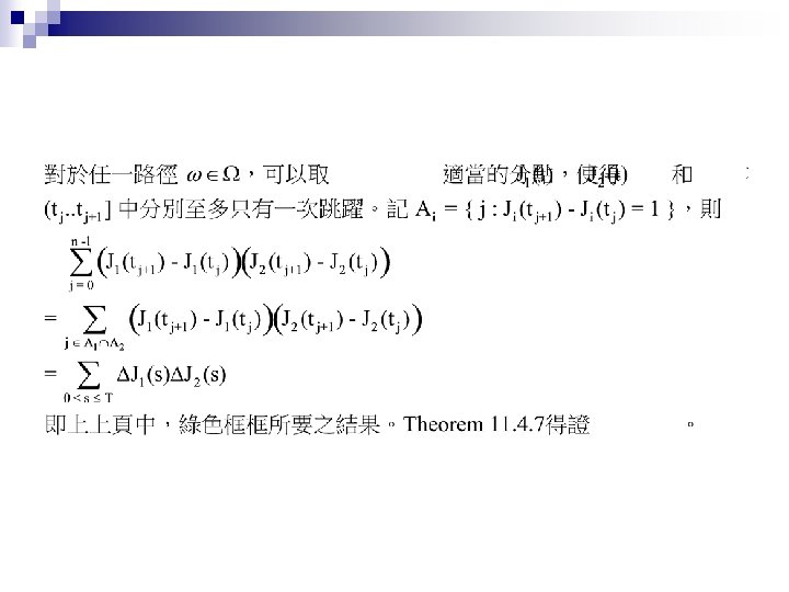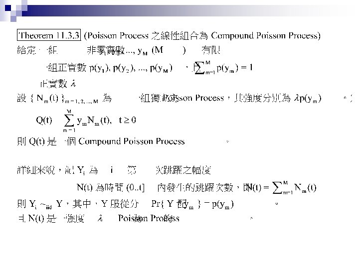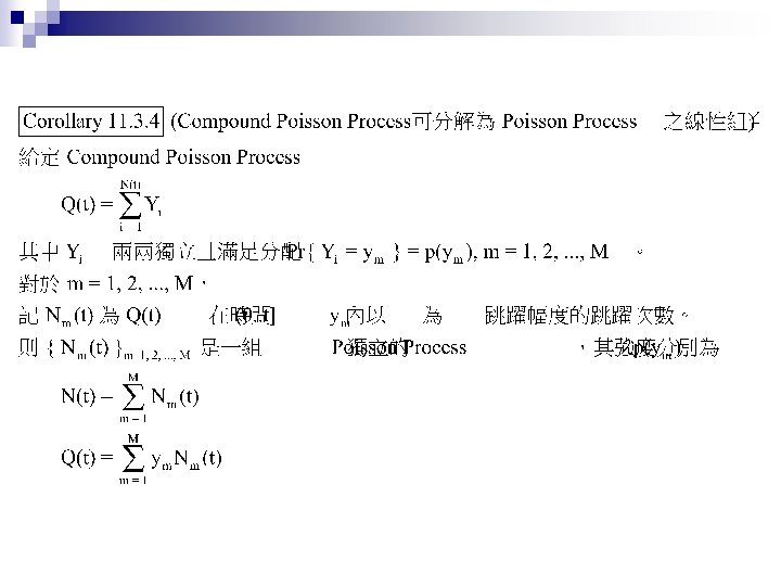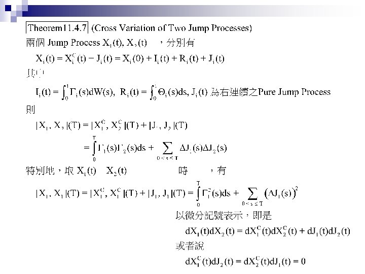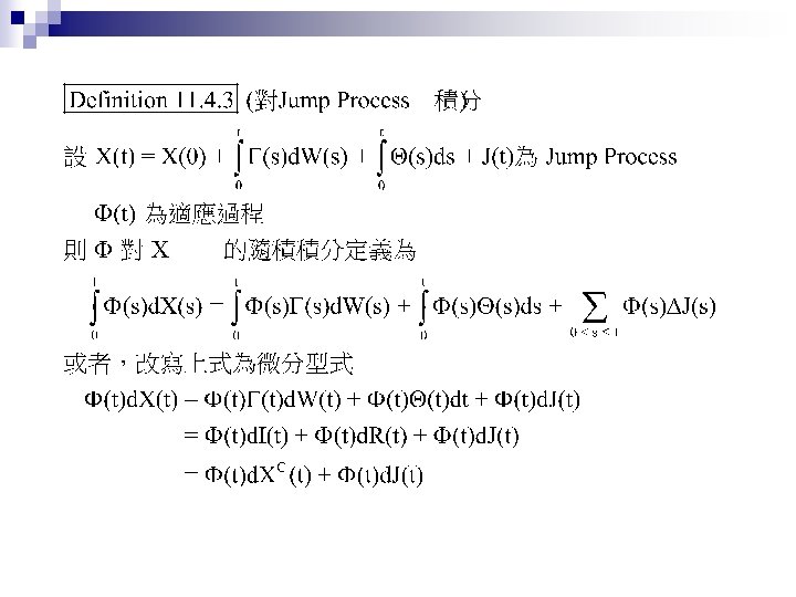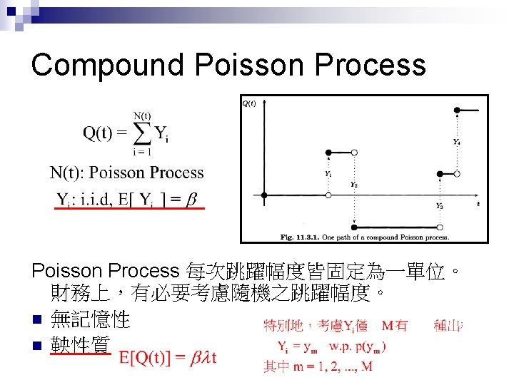 Jump Process Shreve E Stochastic Calculus for Finance Slides: 27 Download presentation Jump Process Shreve E. Stochastic Calculus for Finance II Chap. 11. 1 ~ 11. 4 動機 n Credit Risk: Modeling, Valuation and Hedging Chap. 2. 4. 2 (2. 48 ~ 2. 50) 大綱 Poisson Process n Compound Poisson Process n Jump Process and Their Integrals n Compensated Poisson Process Martingale Property n n n 由 Theorem 11. 2. 3,易知 t > s 時 E[ N(t) – N(s) ] = Var[ N(t) – N(s) ] = λ(t-s) 從而 M(t) = N(t) –λt 是鞅 (martingale)。稱此為 Compensated Poisson 過程。 N(t)在兩次跳躍之間保持為常數。此一性質對 M(t) 並不適用。 大綱 Poisson Process n Compound Poisson Process (Random Jump Size) n Jump Process and Their Integrals n 大綱 Poisson Process n Compound Poisson Process n Jump Process and Their Integrals (黎曼積分 + 伊藤積分 + 純跳躍) n Jump Process之機率空間 Brownian Motion Poisson Process-兩者皆無記憶性,且互相獨立 Jump Process & Its Integral Quadratic Variation Cross Variation