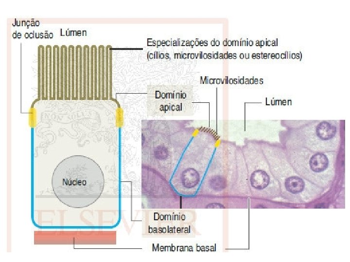 Mantêm as diferenças nas composições moleculares das regiões apical e basolateral das membranas plasmáticas luz ou lumen do intestino Polo apical Junção de oclusão pontos de união direta entre proteínas da membrana (ocludina e claudina) bloqueiam o espaço entre as células Polo baso-lateral