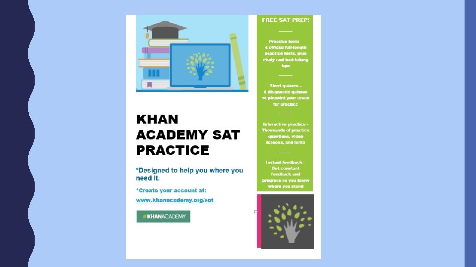 STATE TESTING-MME GR ADU AT ION REQUIRE ME NT AND CO LLEGE ADMISSIONS TEST (SAT) • Tuesday, April 9, 2019 -SAT 7: 40 -1: 30 • Total Score (400 -1600) Evidenced Based Reading and Writing (200 -800), Math (200 -800), and Essay (2 -6) • Scores go on high school transcript per State of Michigan • www. collegeboard. org is best resource for information. Every student should have account. PSAT scores available now. This is how students send future scores. Also has scholarship and career and college exploration tools. • www. khanacademy. org for SAT practice. Can link to College. Board account for individualized free SAT prep. • Bus available at 2: 40 PM.