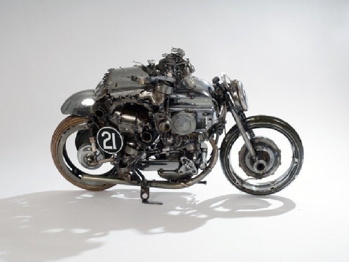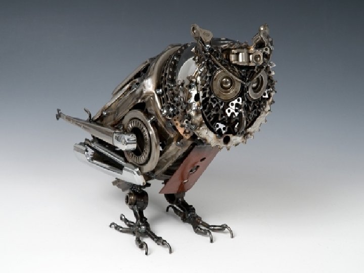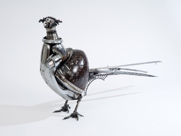 His sculptures are made of gears, spark plugs, exhaust parts, radiator, anything that the artist can achieve.