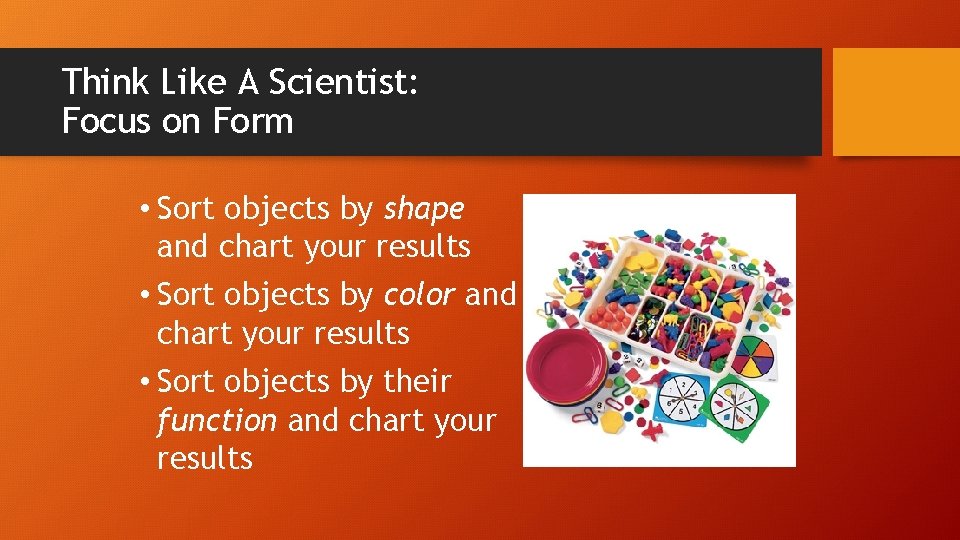 Think Like A Scientist: Focus on Form • Sort objects by shape and chart your results • Sort objects by color and chart your results • Sort objects by their function and chart your results