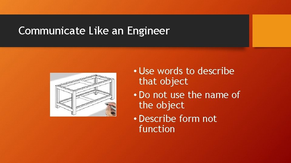 Communicate Like an Engineer • Use words to describe that object • Do not use the name of the object • Describe form not function