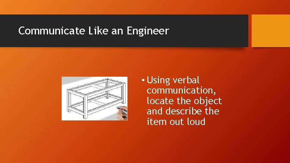 Communicate Like an Engineer • Using verbal communication, locate the object and describe the item out loud