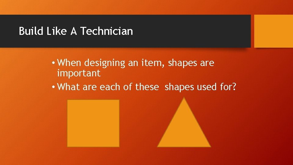 Build Like A Technician • When designing an item, shapes are important • What are each of these shapes used for?