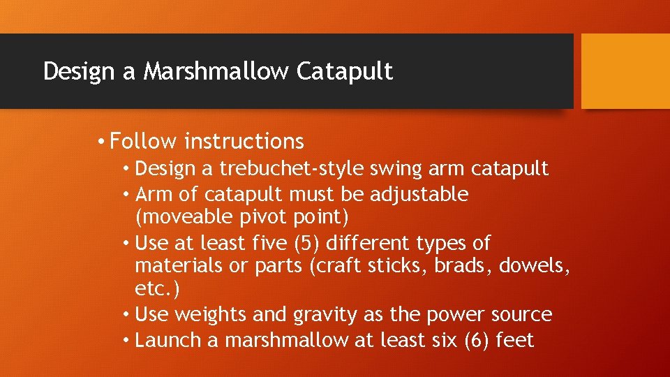 Design a Marshmallow Catapult • Follow instructions • Design a trebuchet-style swing arm catapult • Arm of catapult must be adjustable (moveable pivot point) • Use at least five (5) different types of materials or parts (craft sticks, brads, dowels, etc. ) • Use weights and gravity as the power source • Launch a marshmallow at least six (6) feet