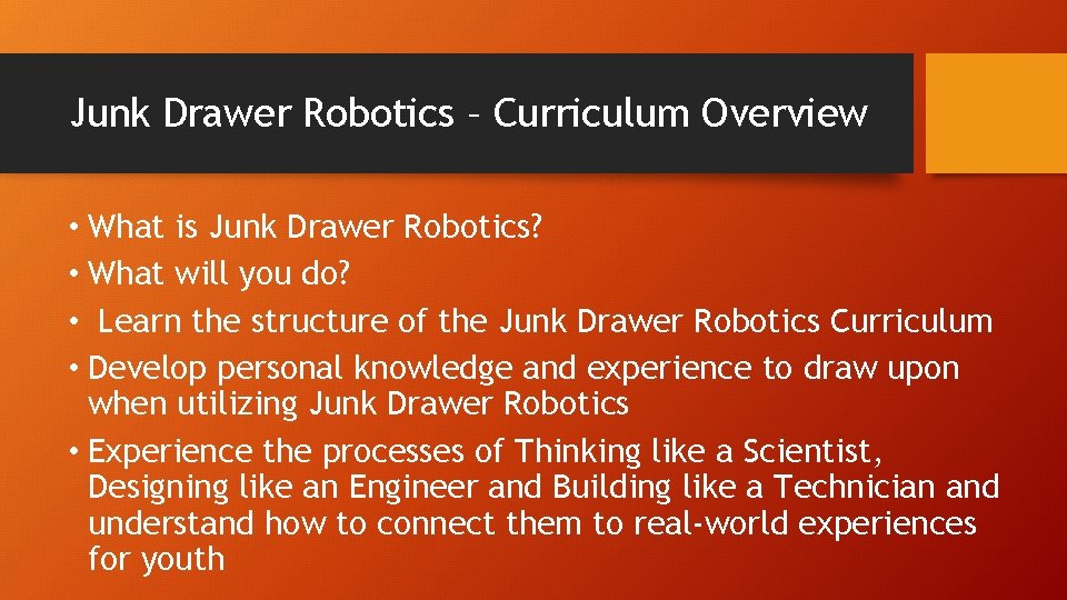 Junk Drawer Robotics – Curriculum Overview • What is Junk Drawer Robotics? • What will you do? • Learn the structure of the Junk Drawer Robotics Curriculum • Develop personal knowledge and experience to draw upon when utilizing Junk Drawer Robotics • Experience the processes of Thinking like a Scientist, Designing like an Engineer and Building like a Technician and understand how to connect them to real-world experiences for youth