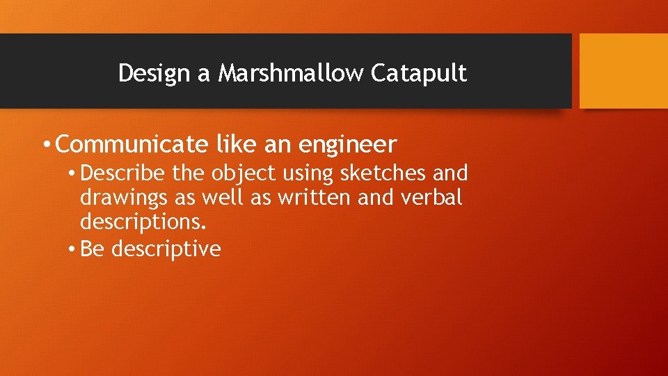 Design a Marshmallow Catapult • Communicate like an engineer • Describe the object using sketches and drawings as well as written and verbal descriptions. • Be descriptive