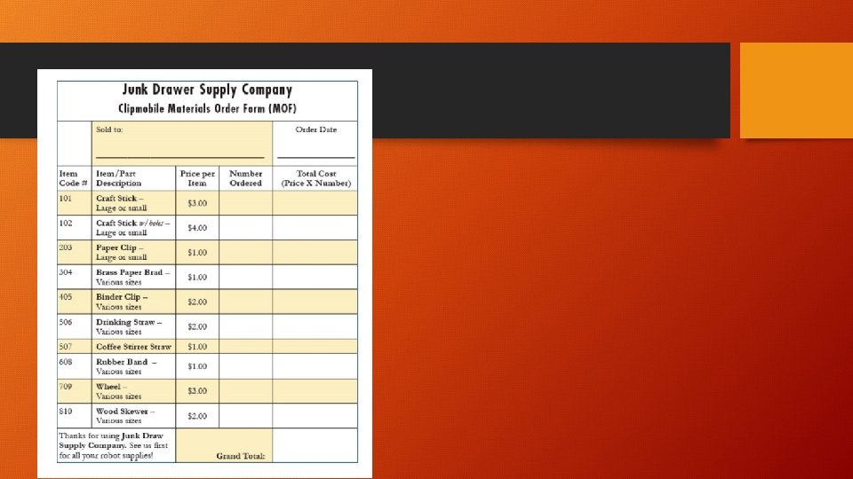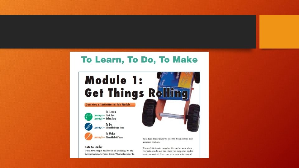 JUNK DRAWER ROBOTICS • Youth will explore movement and friction • Youth will test rolling friction by adding wheels • Youth will plan and design a vehicle to maximize its ability to coast based on effects of friction • Youth will build a complex clipmobile.