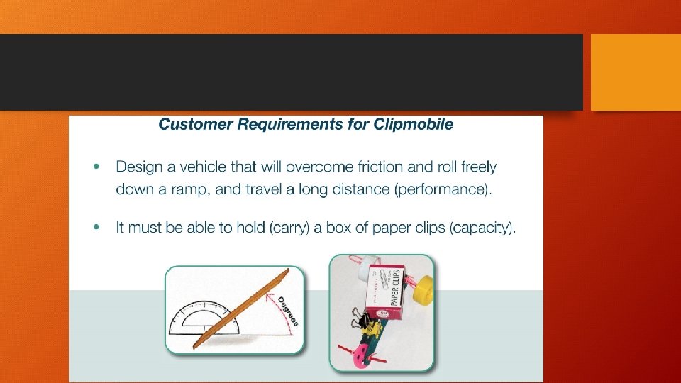 SLIP N SLIDE: TO LEARN • Compare and select materials based on how they may affect sliding friction. • Test sliding a box of paper clips on several surfaces • Test by raising angle of ramp • Measure angle at which box begins to move and record results • Repeat to get an average