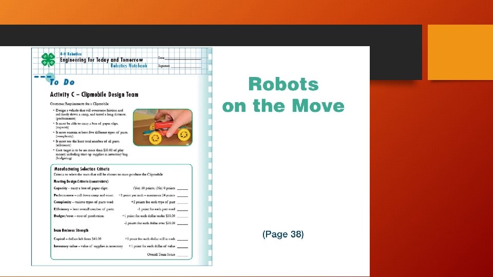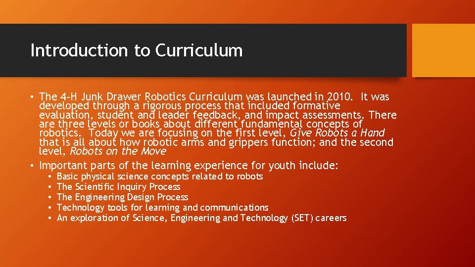 Introduction to Curriculum • The 4 -H Junk Drawer Robotics Curriculum was launched in 2010. It was developed through a rigorous process that included formative evaluation, student and leader feedback, and impact assessments. There are three levels or books about different fundamental concepts of robotics. Today we are focusing on the first level, Give Robots a Hand that is all about how robotic arms and grippers function; and the second level, Robots on the Move • Important parts of the learning experience for youth include: • • • Basic physical science concepts related to robots The Scientific Inquiry Process The Engineering Design Process Technology tools for learning and communications An exploration of Science, Engineering and Technology (SET) careers
