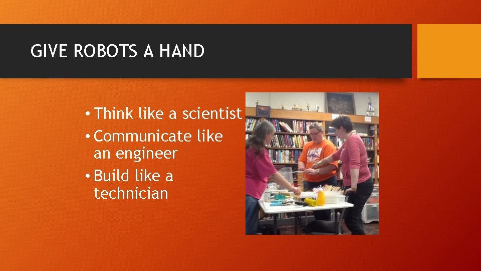 GIVE ROBOTS A HAND • Think like a scientist • Communicate like an engineer • Build like a technician