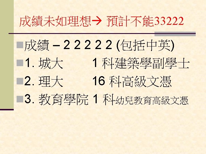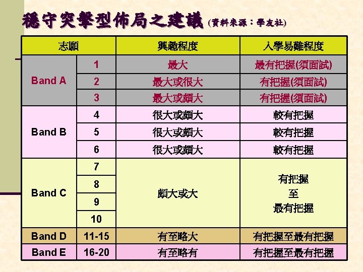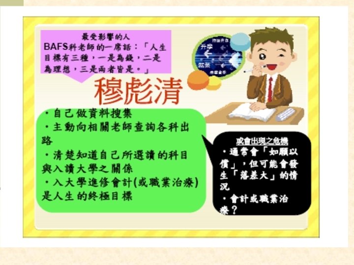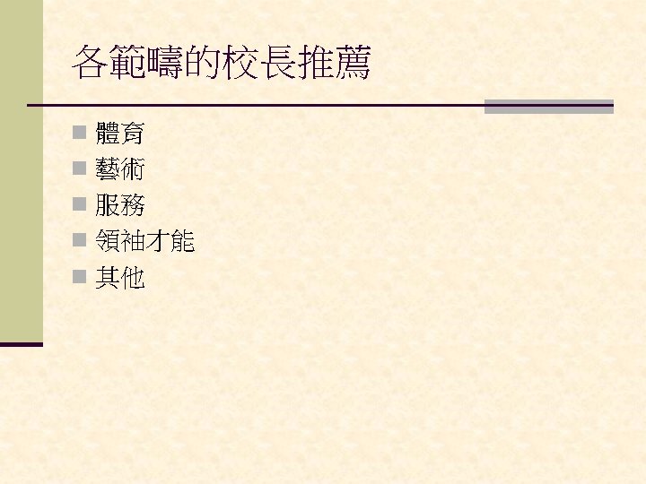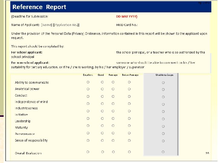 操行評語 Excellent, Good, Average, Below average, Unable to judge n n n n n 1. Ability to communicate 傳意能力 2. Analytical power 分析能力 3. Conduct 操行 4. Independence of mind 獨立思考 5. Industriousness 勤勉 6. Initiative 主動性 7. Leadership 領導才能 8. Maturity 成熟 9. Perseverance 毅力 10. Sense of responsibility 責任感