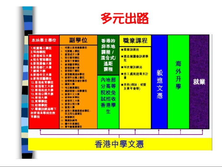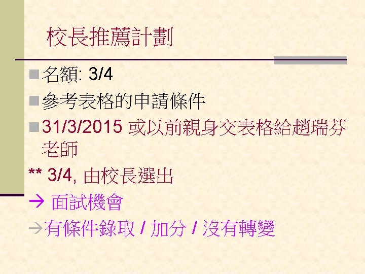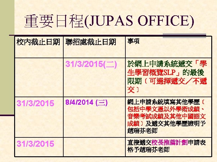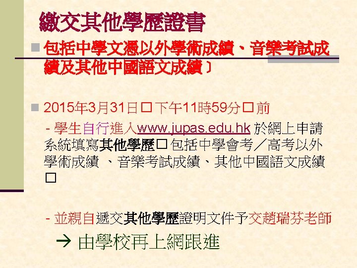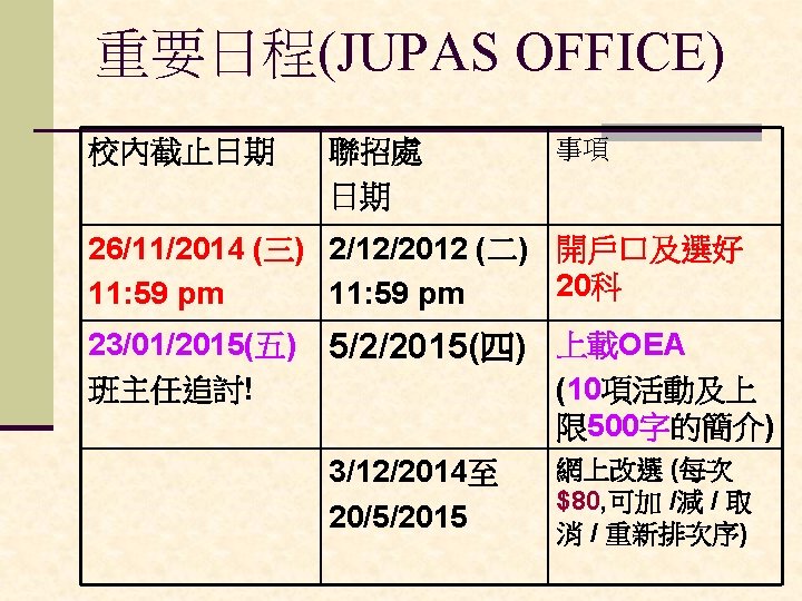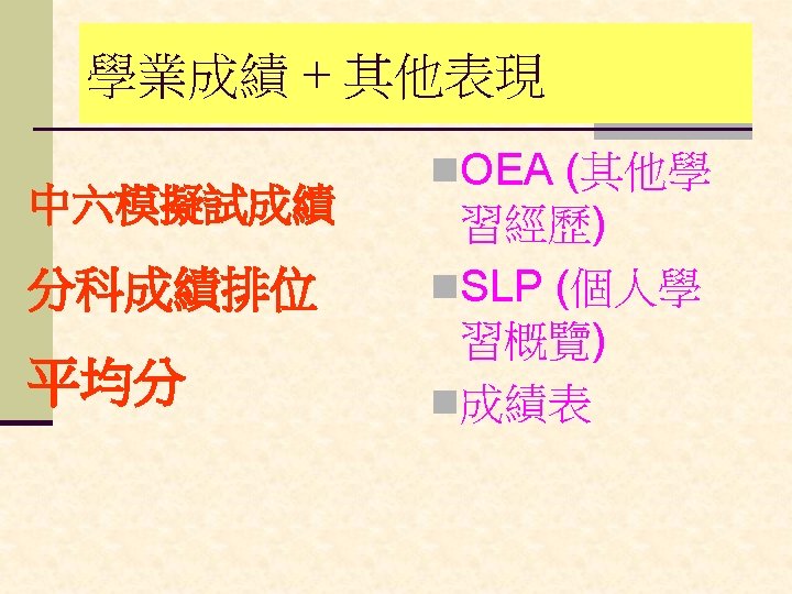 OEA (Other Experience and Achievement) – 校內 n 1. Community service 社會服務 n 2. Career related experience 與 作相關的經驗 n 3. Physical development 體育發展 n 4. Aesthetic development 藝術發展 n 5. Moral and civic education 德育及公民教育 n 6. Others 其他 n Role – Participation (參與者) VS Leader (領袖) n Award – Competition (比賽)VSParticipation(參與者)