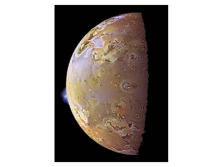 IO • Closest large moon to Jupiter • Orbital period = 42 hrs • Surface has no impact craters, so less than 1 million years old • Many volcanic craters – active volcanoes • No water (too hot), but lots of sulfur on surface (sulfur condenses easily; appears black when heated)