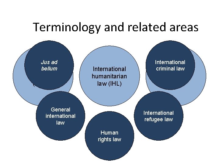 Terminology and related areas Jus ad Law ofbellum armed conflict (LOAC) International humanitarian law (IHL) General international law International criminal law Jus in bello International refugee law Human rights law